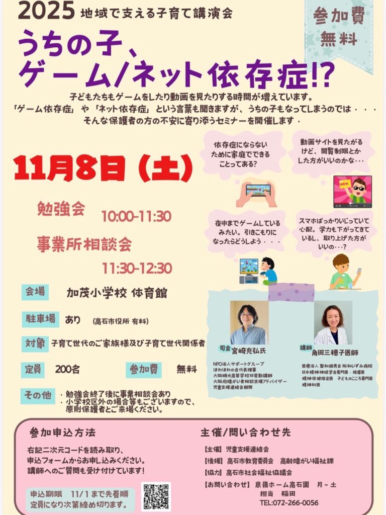 11月8日(土)に加茂小学校で、地域で支える子育て講演会があります。テーマは「うちの子、ゲーム/ネット依存症?」です。